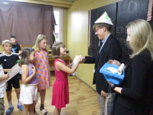 Po obědě a poledním klidu jsme se věnovali aktivitám v oddílu. Hráli jsme seznamovací hry, vymýšleli jsme názvy družin a trénovali počítání. Dalším velkým úkolem na odpoledne bylo vyrobit dárky pro pana starostu, protože jsme se na poslední chvíli dozvěděli, že má dnes narozeniny.